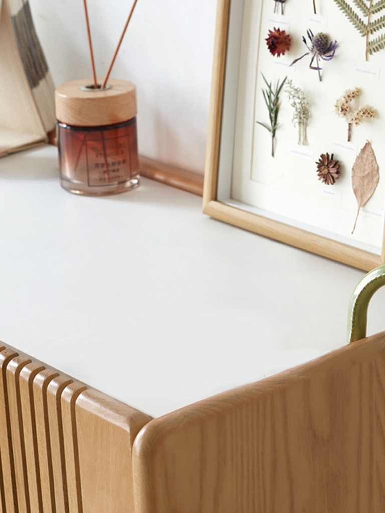 Chất liệu: Gỗ Tần Bì (Ash)_45% + Cao Su Phủ Veneer_55% + Đá Moka Trắng