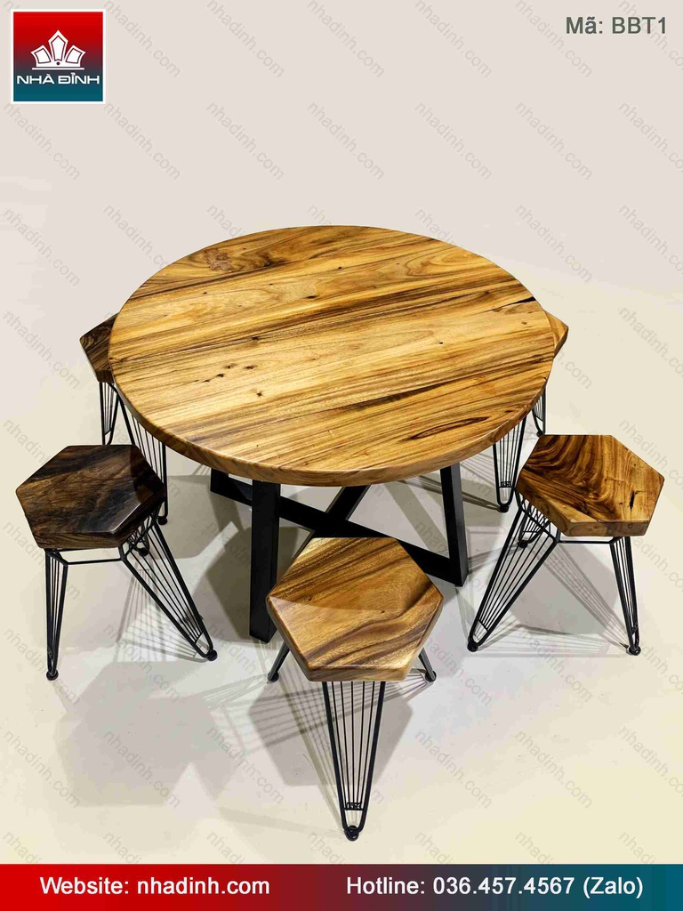 Bàn Tròn Gỗ Me Tây Mặt Ghép Và 6 Ghế Đẩu Đường Kính 100 Dày 5 (cm)
