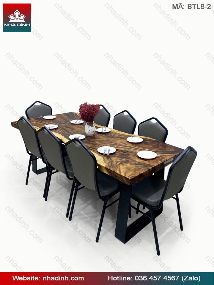 Bộ Bàn Ăn 8 Ghế Gỗ Me Tây Nguyên Khối Dài 210 Rộng 84,5-68-100 Dày 6,3 (cm)