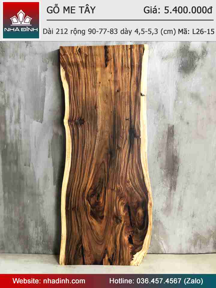 Mặt Bàn Gỗ Me Tây Nguyên Khối Dài 212 Rộng 90-77-83 Dày 4,5 (cm)