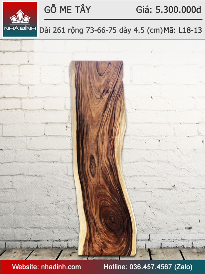 Mặt bàn gỗ Me Tây nguyên khối dài 261 rộng 73-66-75 dày 4,5 (cm)