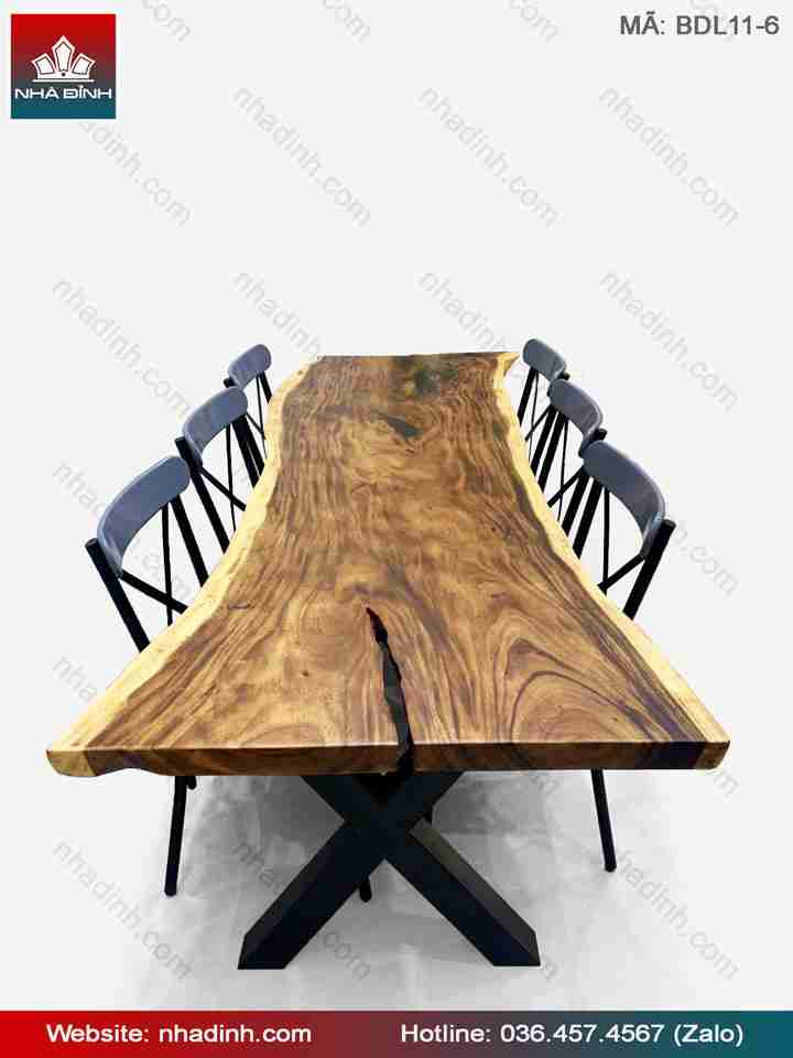 Bộ bàn ăn gỗ Me Tây 6 ghế trên là dạng hình bàn dài tự nhiên, kết hợp với chân sắt chữ X, mang lại cảm giác hiện đại, mới mẻ và hoành tráng cho phòng bếp nhà bạn.