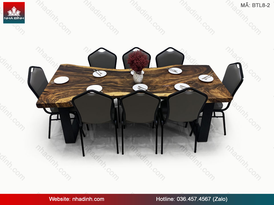 Bộ Bàn Ăn 8 Ghế Gỗ Me Tây Nguyên Khối Dài 210 Rộng 84,5-68-100 Dày 6,3 (cm)