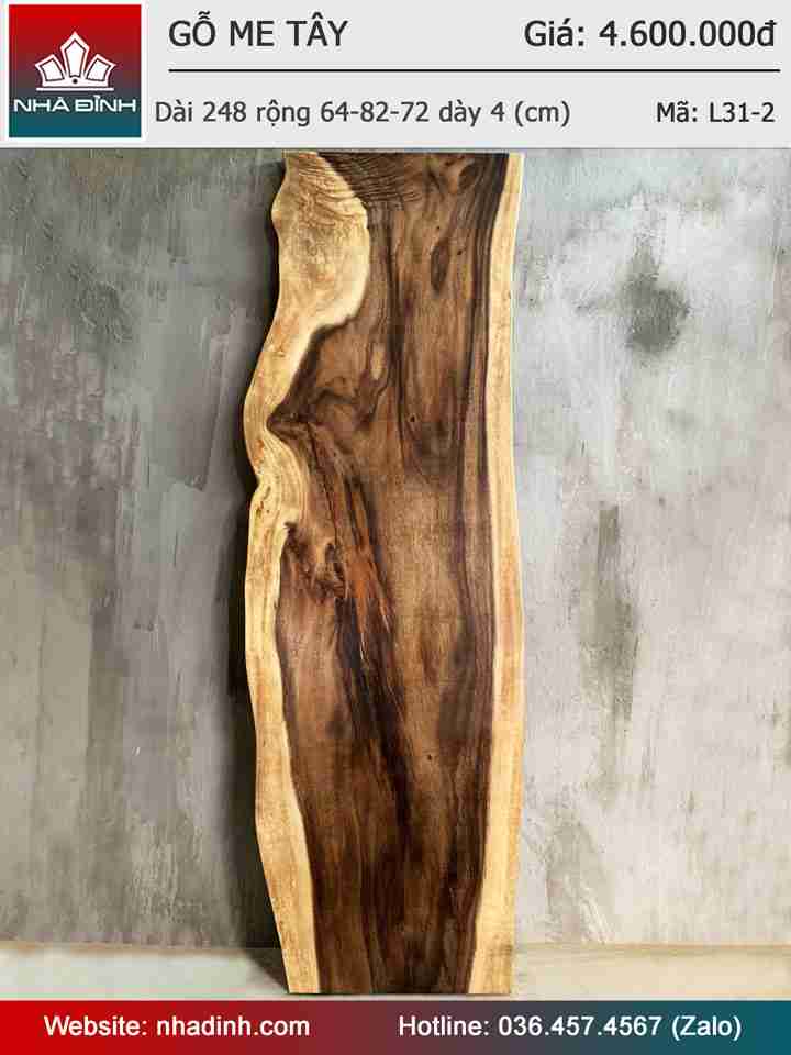 Mặt Bàn Ăn Gỗ Me Tây Nguyên Khối Dài 248 Rộng 64-82-71 Dày 4 (cm)