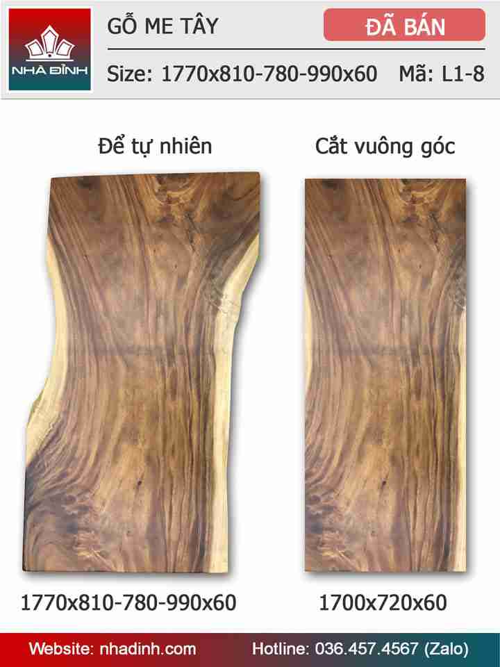 Mặt bàn gỗ Me Tây nguyên khối dài 1m77 rộng 81 - 78 - 99 dày 6 (cm)