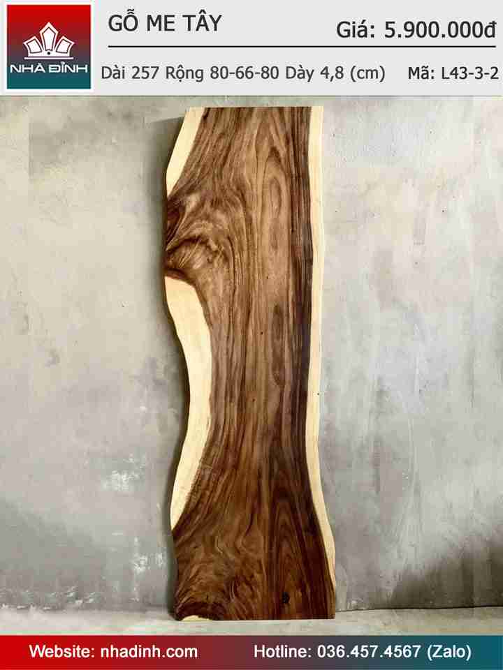 Mặt Bàn Gỗ Me Tây Nguyên Khối Dài 257 Rộng 80-66-80 Dày 4,8 (cm)